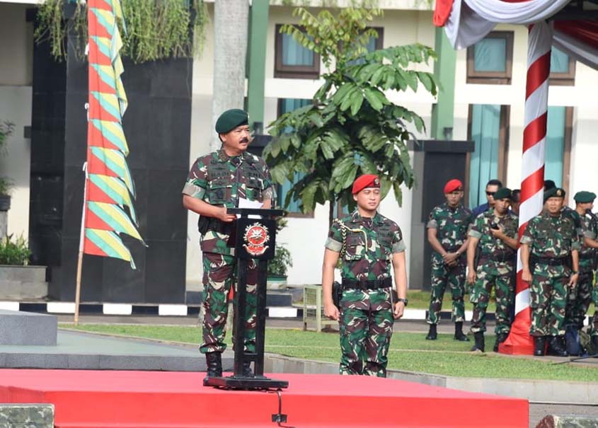 “Teguhkan hati dalam mengabdi pada negara demi menjaga tetap tegaknya kedaulatan dan keutuhan NKRI. Loyalitas kita tegak lurus hanya kepada negara, dan kepada Pimpinan TNI, demi menjaga garis komando, serta legalitas pergerakan pasukan,” tegas Panglima seraya menyemangati prajurit.