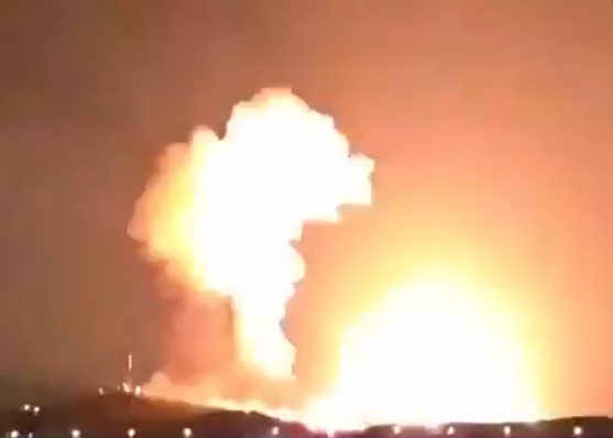 Rekaman tersebut menunjukkan serangkaian ledakan, diikuti oleh kebakaran besar yang menerangi langit malam dengan warna oranye.